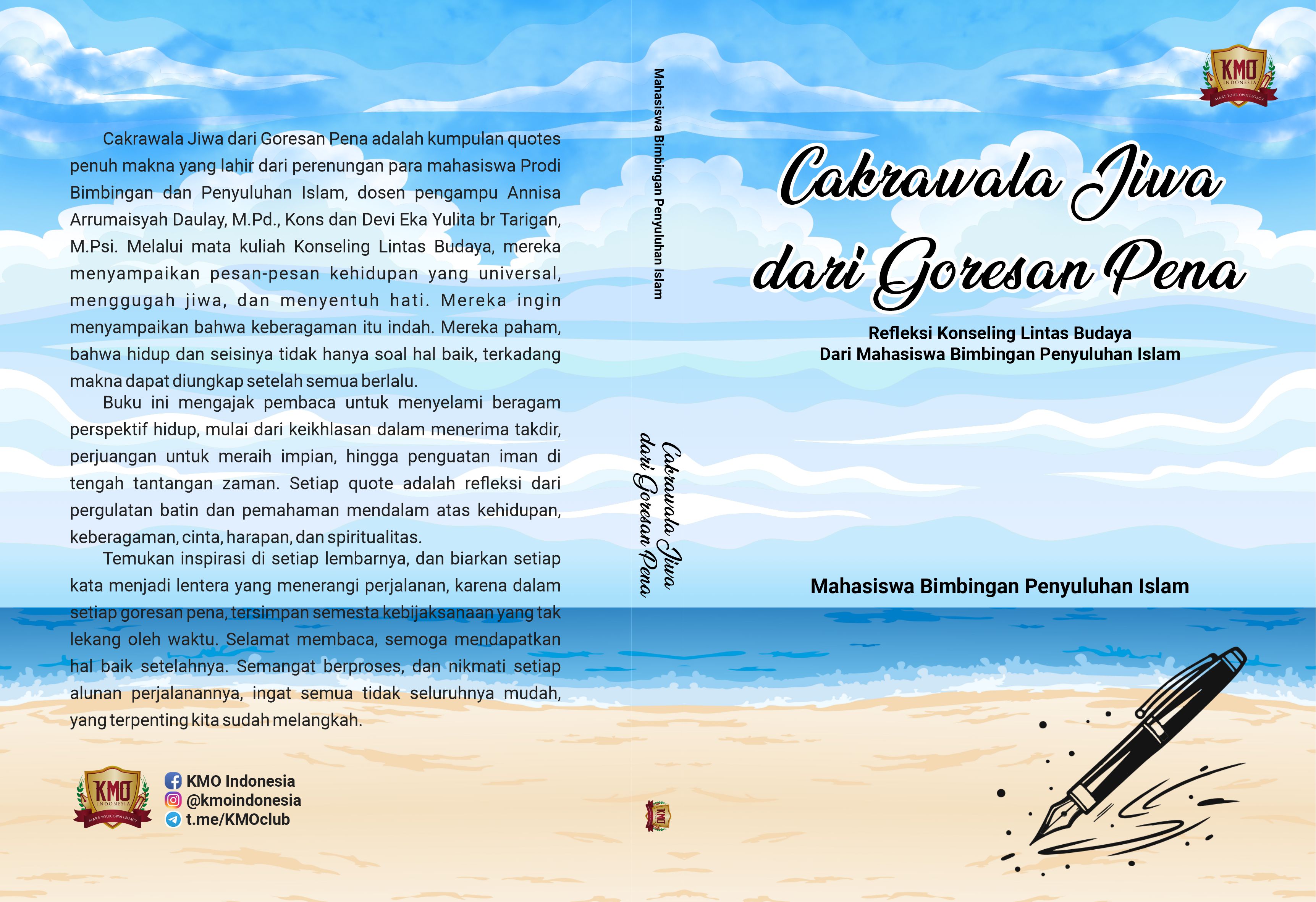 Cakrawala Jiwa dari Goresan Pena adalah kumpulan quotes penuh makna yang lahir dari perenungan para mahasiswa Prodi Bimbingan dan Penyuluhan Islam, dosen pengampu Annisa Arrumaisyah Daulay, M.Pd., Kons dan Devi Eka Yulita br Tarigan, M.Psi. Melalui mata kuliah Konseling Lintas Budaya, mereka menyampaikan pesan-pesan kehidupan yang universal, menggugah jiwa, dan menyentuh hati. Mereka ingin menyampaikan bahwa keberagaman itu indah. Mereka paham, bahwa hidup dan seisinya tidak hanya soal hal baik, terkadang makna dapat diungkap setelah semua berlalu.